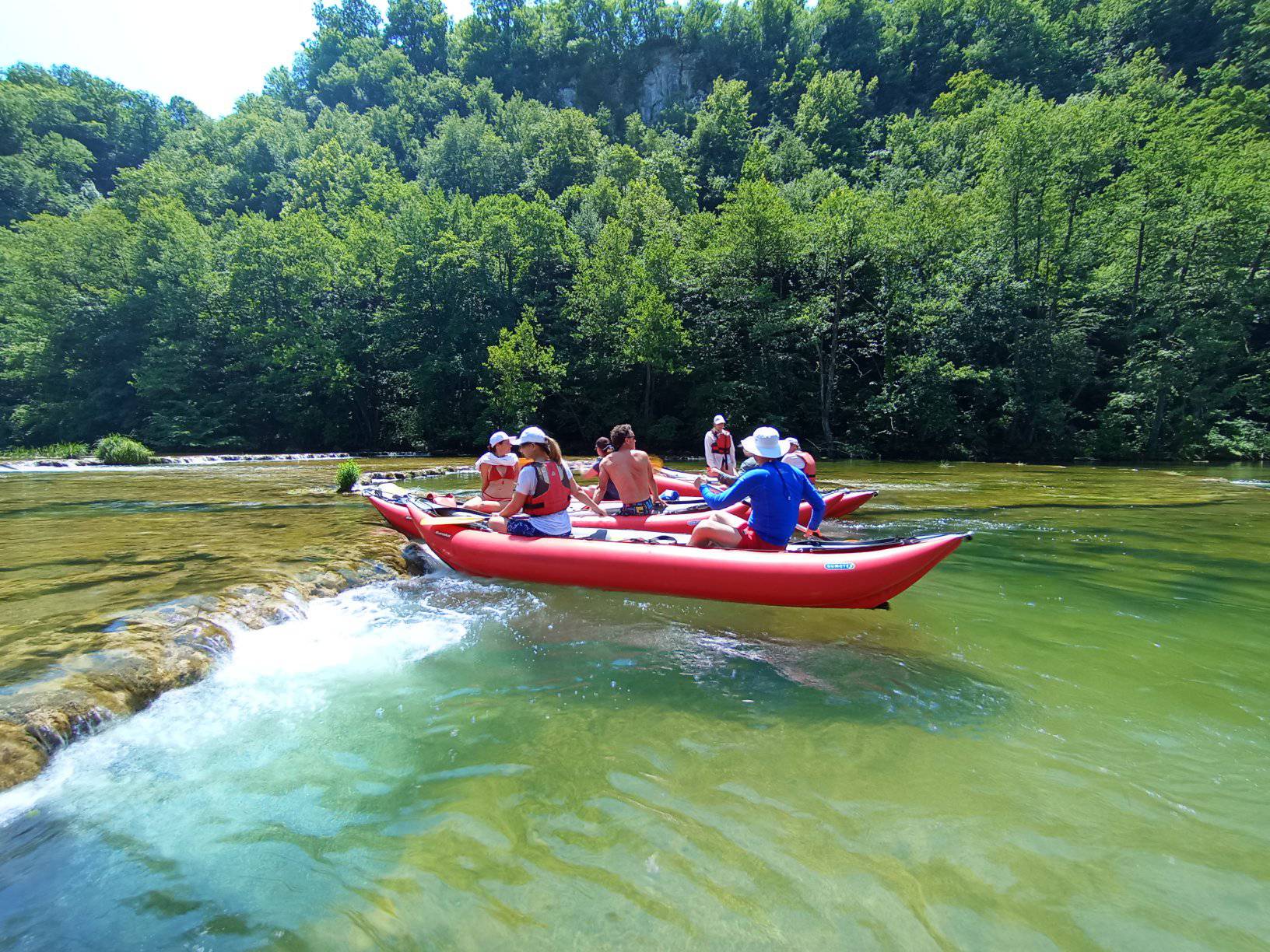 Slunjban a transzefer után egyből vízre szállunk és megkezdjük kalandjainkat. Egyik vízesés éri a másikat, nem nehezek, de mindegyik külön kaland, nincs két egyforma, itt mindenki maga győzi le és emeli fel magát. Túravezetőink biztosítanak, felfedezik és mutatják a legjobb útvonalat. A vízeséseket folyamatosan váltogatják az összefüggő lépcsős kaszkádok, azokat a tükörsíma, szinte álló víz felületek, a fürdésre hívogató homokos partok. A vadonban túrázunk, csak mi vagyunk itt, piros hajóink, a fehér sziklák és a kék-zöld mindenféle árnyalatában habzó víz.