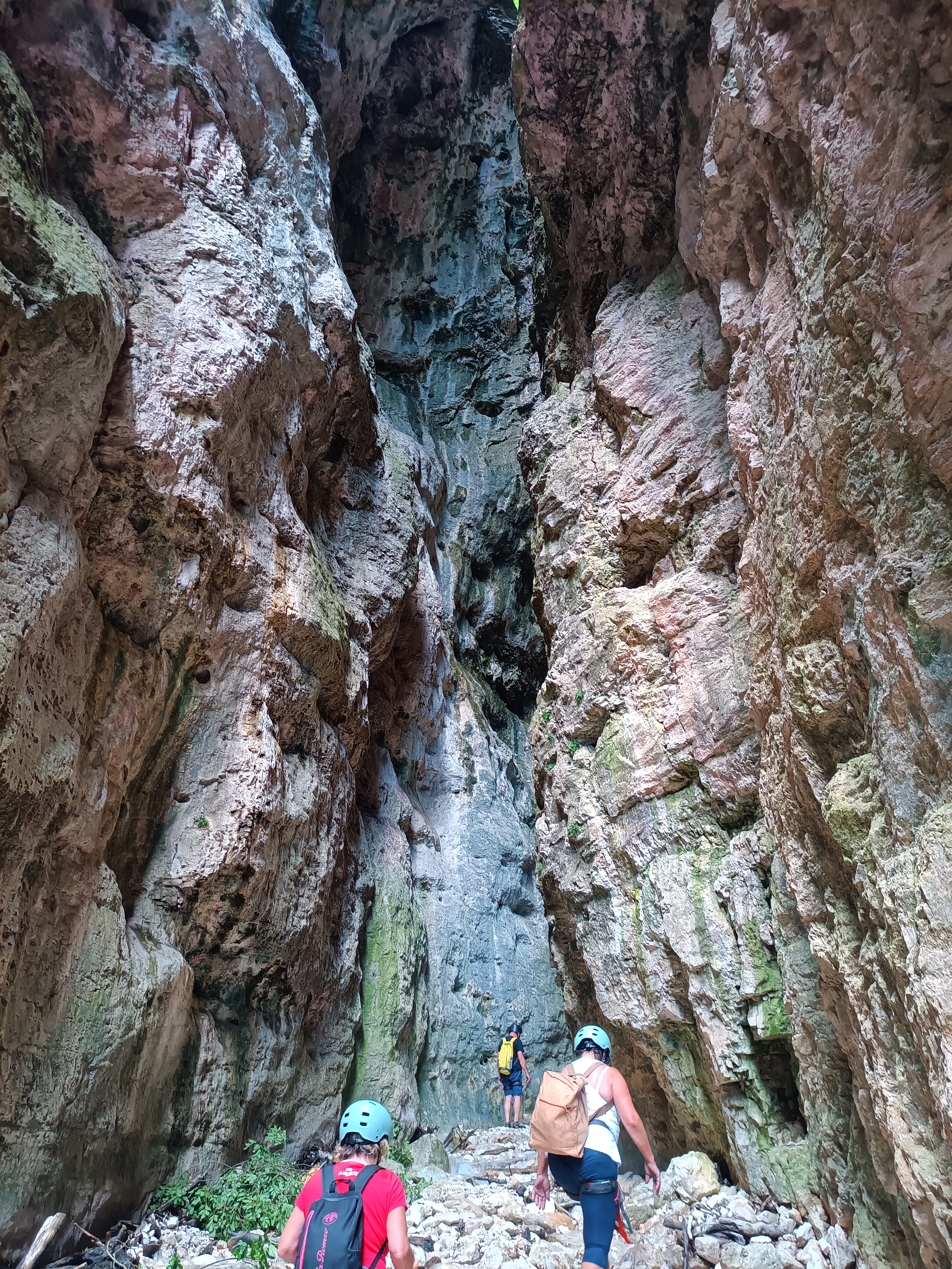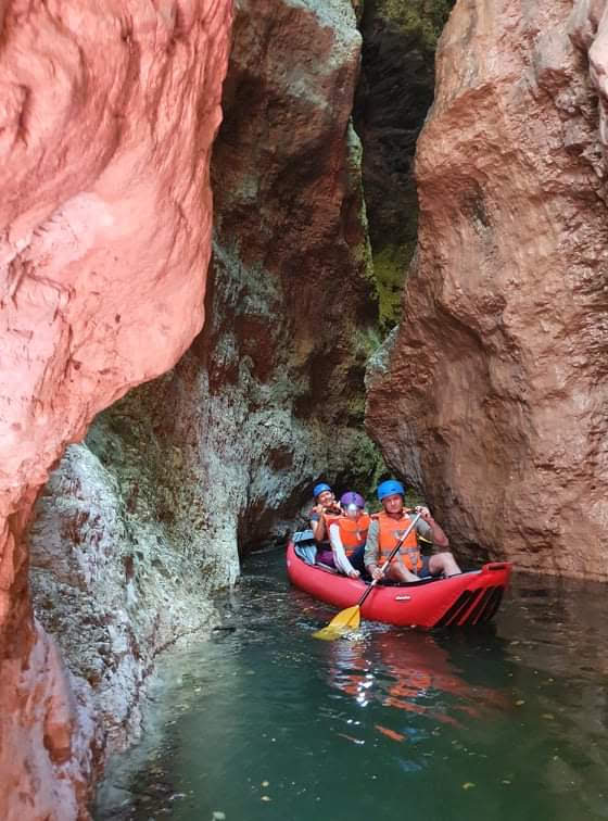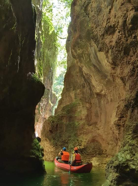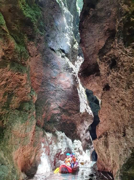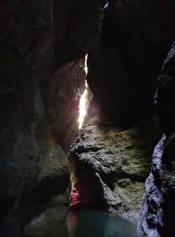 Első nap csütörtök délelőtt: Evezés a hegy mélyén. Ilyent eddig csak Új-Zélandi videókon láttál. Egymásba fonódó hegy mélyi kis kanyonokban kék-barna sziklák által övezett, még belátható hasadékokkal kezdünk, melyek egyre szűkülnek, színüket állandóan váltogatják, a becsillanó nap valószínűtlen árnyjátékkal borzongat, a végén már előkerül a fejlámpa is, koromsötétben evezünk, egyre erősödően halljuk a ködhegység dalát … de azután ismét fény dereng és lassan kiérünk a napsütésbe. Titkos, alig elférős, hátborzongatóan gyönyörködős, lélegzet visszatartós, hegy mélyi expedíciónkon azon sem csodálkoznál, ha egyszer csak Gollam vagy egy Tünde alakját látnád feltűnni a sziklák között. Ha akarod, ha nem, itt suttogóra fogod és titkos felfedezőnek érzed magad, mert olyan helyeken evezel, amilyeneken eddig még soha.
